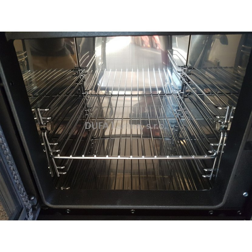 Provedení s píckou z nerez oceli vybavenou varnou mřížkou a teploměrem, rozměry trouby 270x300x240 mm.